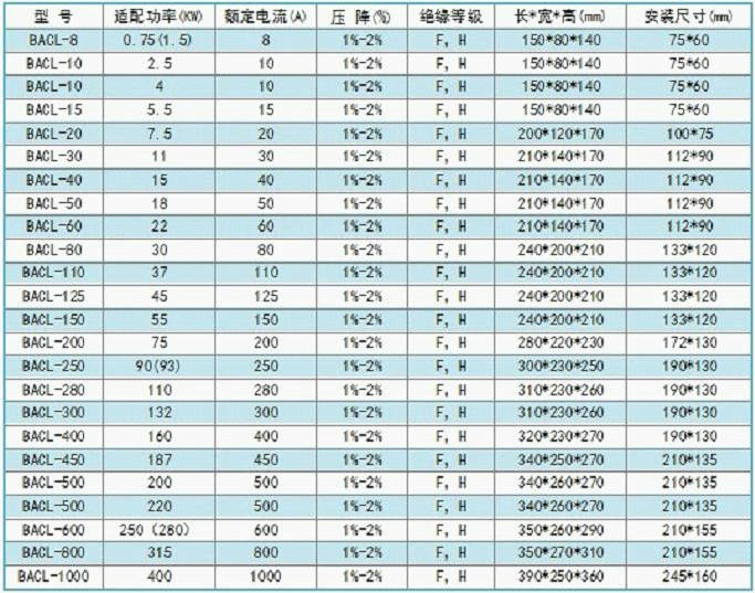 技術(shù)參數(shù) (Technical Parameter) 1.額定工作電壓:380V/50Hz或者660V/50Hz 2.額定工作電流:3A至2000A/40℃ 3.抗電強度:鐵芯-繞組3000VAC/50Hz/5mA/10s無飛弧擊穿 4.絕緣電阻:1000VDC絕緣阻值≥100MΩ 5.電抗器噪音:小于65dB(與電抗器水平距離點1米測試) 6.防護等級:IP00 7.絕緣等級:F級以上