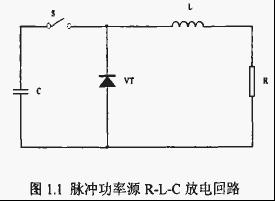 電磁發射研究所使用的脈沖能源系統輸出功率高(達到G瓦級),工作電壓高(幾~幾十千伏),輸出脈沖電流大(幾十~幾百千安)。由于脈沖功率源必須根據負載的要求提供能量,所提供的電能調節范圍較寬。因此,脈沖成形網絡是高功率脈沖電源的核心I”。圖1.1為脈沖功率源基本原理的R.L.C放電回路圖中,c是儲能電容,L是電抗器,R是負載,S是高壓開關,VT是續流硅堆。首先,開關閉合,電容通過電感、開關和負載構成回路進行放電。此時設定適當的電感參數就可以將電流峰值和脈沖寬度限制在一定的范圍內,達到限流和調整帶寬的目的。當電容放電完畢,能量以磁能形式儲存到電感中。然后,開關斷開,電抗器中的能量通過電感、開關、負載和二極管回路提供給負載。