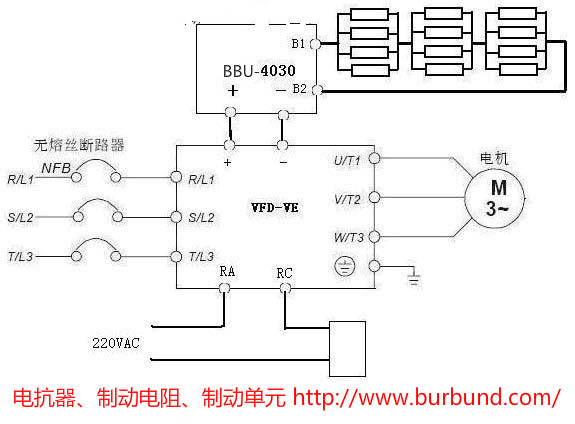 1.主電路設(shè)計(jì) 由于臺(tái)達(dá)變頻器功率大于11KW型號(hào)等級(jí)無內(nèi)置制動(dòng)單元,所以選配外置推薦常州博邦電氣BURBUND品牌制動(dòng)單元BBU-4030一臺(tái),標(biāo)配的常州博邦電氣BURBUND品牌制動(dòng)電阻型號(hào)為BWR-4800W-27RJ。VE系列變頻器電氣接線圖如下。